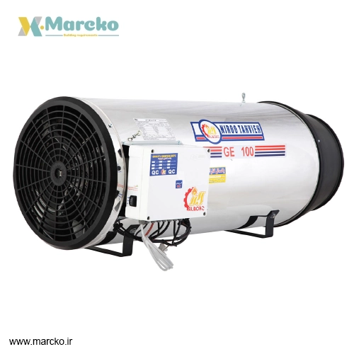 جت هیتر گازی البرز مدل GE-100 ، با توان حرارتی 100 هزار کیلوکالری در ساعت و سوخت مصرفی گاز برای گرمایش فضاهایی بزرگ همچون سالنهای مرغداری، سولههای صنعتی و کارگاههای ساختمانی مورد استفاده قرار میگیرد، میزان هوادهی دستگاه 7000 مترمکعب در ساعت بوده و قابلیت هدایت هوای گرم را تا فاصله 20 متری دارا میباشد، که میتواند دمای محیط را به 50-40 درجه سانتیگراد برساند. این مدل از هیترها به شکل ثابت بر روی چهارپایه و به صورت آویز با زنجیر قابل نصب می باشد که با نصب ترموستات محیطی روی آن می توان از گرمای یکنواخت محیط اطمینان حاصل کرد. جت هیتر دوگانه سوز البرز مدل GE-100 ، با توان حرارتی 100 هزار کیلو کالری در ساعت برای گرمایش فضاهایی بزرگ همچون سولههای صنعتی و کارگاههای ساختمانی مورد استفاده قرار میگیرد، میزان هوادهی دستگاه 7000 مترمکعب در ساعت بوده و قابلیت هدایت هوای گرما تا فاصلهی 20 متری توسط دستگاه امکانپذیر می باشد، که می تواند دمای محیط را به 50-40 درجه سانتیگراد برساند. نصب این مدل از هیترها به صورت آویز و روی پایه می باشد که با نصب ترموستات محیطی بر روی آن می توان از گرمای یکنواخت محیط اطمینان حاصل کرد.